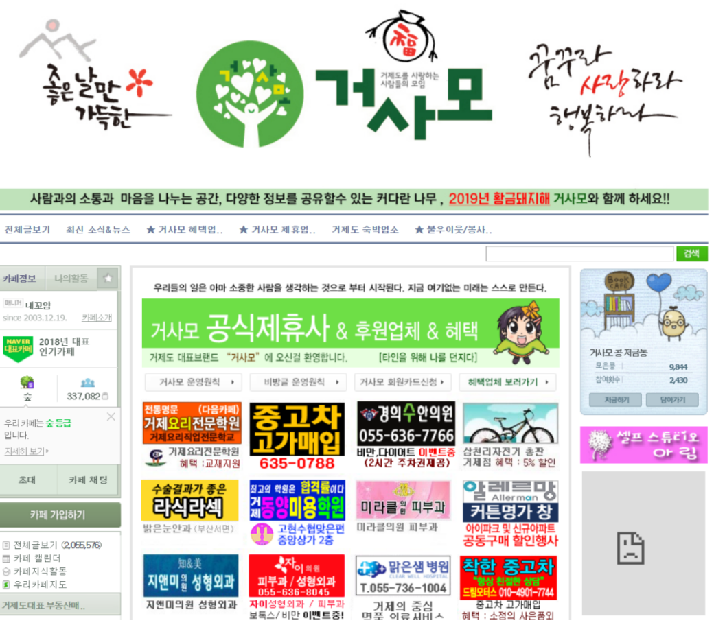 거제도에 사는 젊은 사람이라면 대부분의 사람이 가입을 하고 있는 카페가 바로 거제 거사모 카페라고 생각합니다. 거사모는 거제도를 사랑하는 사람들의 모임 이라고 하고 줄여서 거사모라고 하는 것 같습니다. 거제도에서 살기 위해서는 필수 정보가 많이 들어 있습니다.