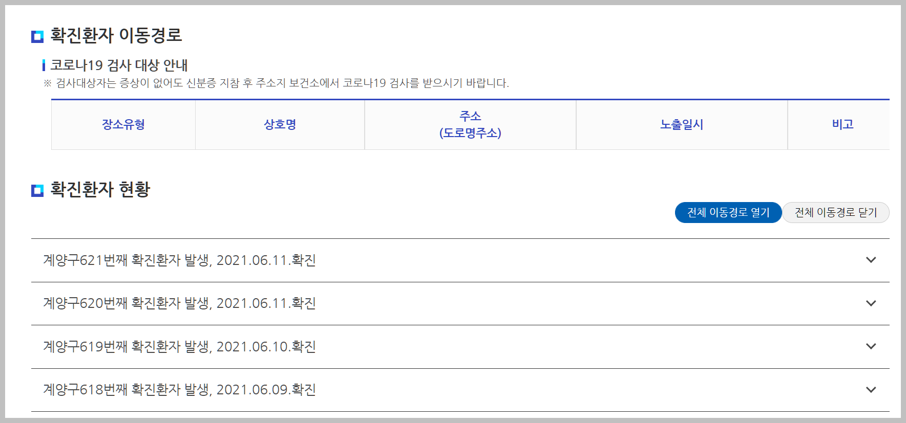 현재 확진환자는 위와 같이 비워있는 상황입니다. 그 이유는 공개를 하지 않아도 모두 동선이 확인이 되었기 떄문입니다. 또는 14일이 지나서 더이상 의미가 없기 때문입니다.