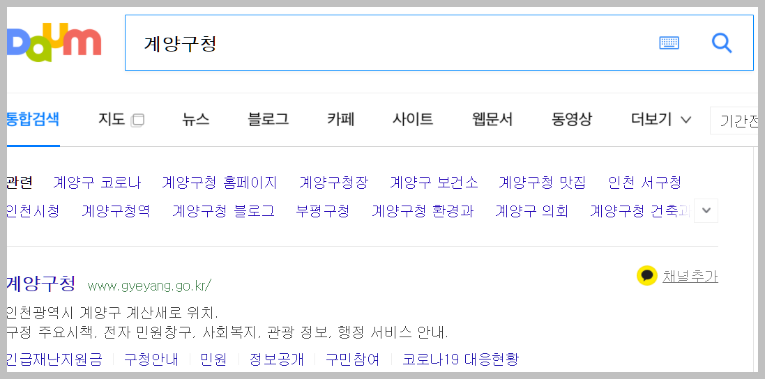 위 화면은 다음과 네이버에서 간단하게 계양 구청이라고 검색을 했을때의 검색결과입니다. 가장 맨위의 결과를 선택하시면 손쉽게 인천광역시 계양구청 홈페이지로 들어가실 수 있습니다.