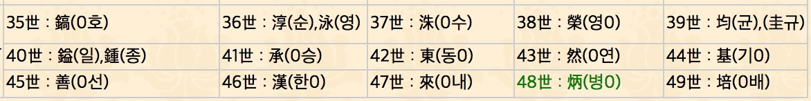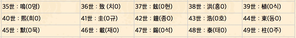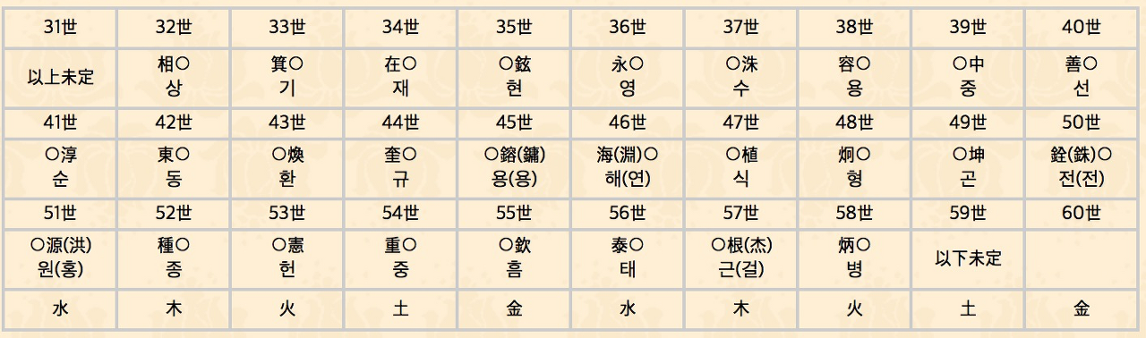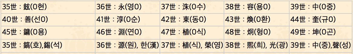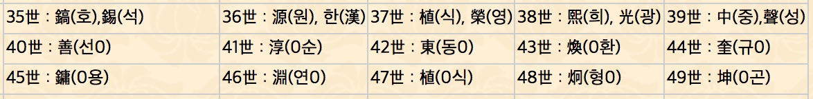 위의 표는 광산김씨 홈페이지에서 가지고온 돌림자입니다. 32세 부터 58세까지 나와있습니다. 이 항렬표는 57년에 간행된 한성대보 및 96년에 속간된 평장지에 의한것이라고 합니다. 이 항렬표를 모든 파에서 일괄적으로 정해지는것이 아니라 일부는 자체적으로 항렬자를 따로 정하여 한다고 합니다.