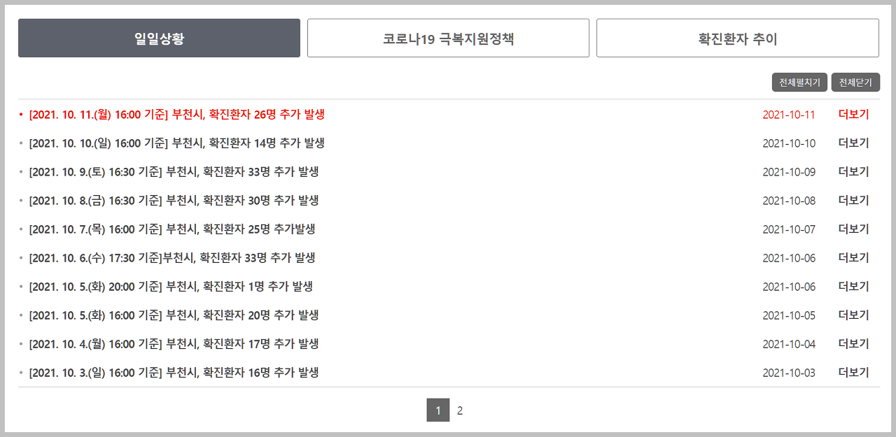 그리고 부천시 코로나19 대응을 조금 더 살펴보시려면 조금 더 아래를 내려보시면 일일상황 보고 페이지가 나오게 됩니다. 이를 확인하시면 부천시 코로나 발생 현황에 대해서 조금 더 상세하게 살펴 볼 수 있습니다.