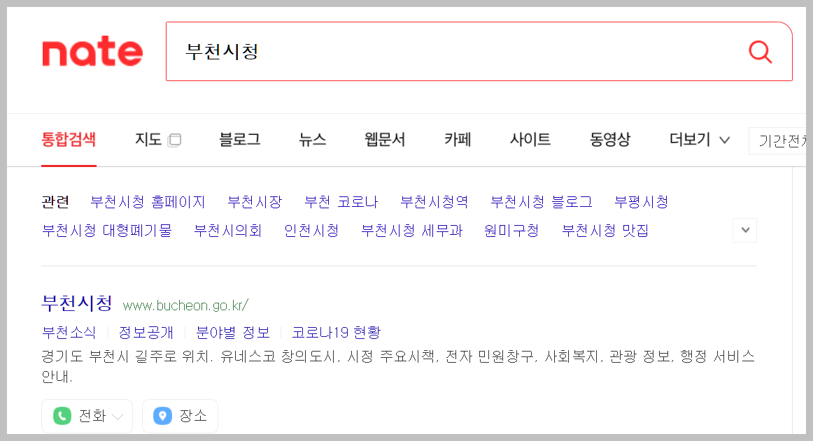 이런 검색결과는 네이트도 마찬가지 입니다. 어떤 검색엔진을 사용을 하더라도 '부천시청' 을 검색을 하면 손쉽게 부천시청 사이트로 들어가실 수 있습니다.