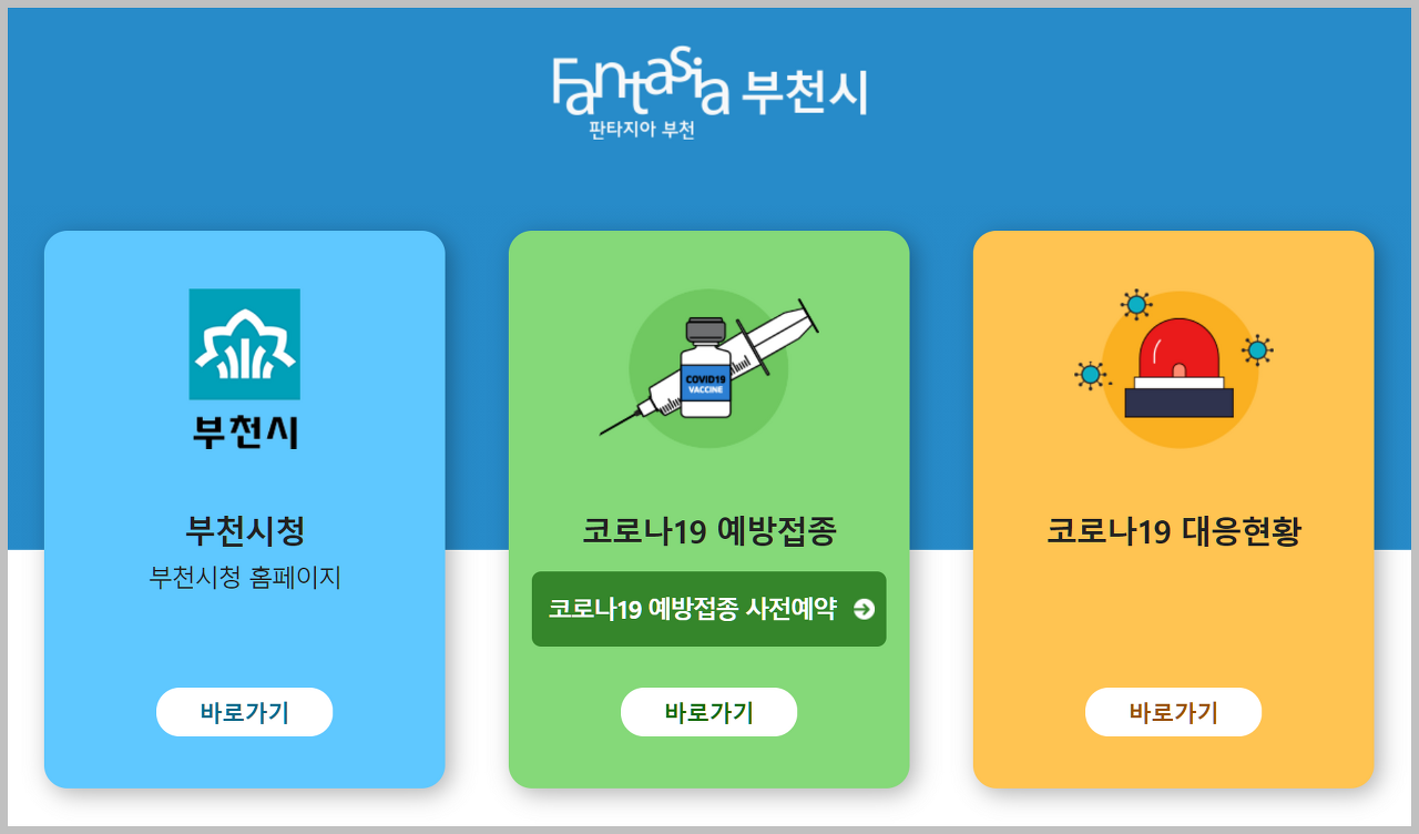 코로나19와 관련된 정보를 쉽게 얻을 수 있는 사이트는 자신이 거주하고 있는 지자체 사이트입니다. 이 사이트를 통해서 정말 다양한 정보들을 얻을 수 있습니다. 부천시에 사시는 분은 부천시청 홈페이지로 들어가시면 됩니다.