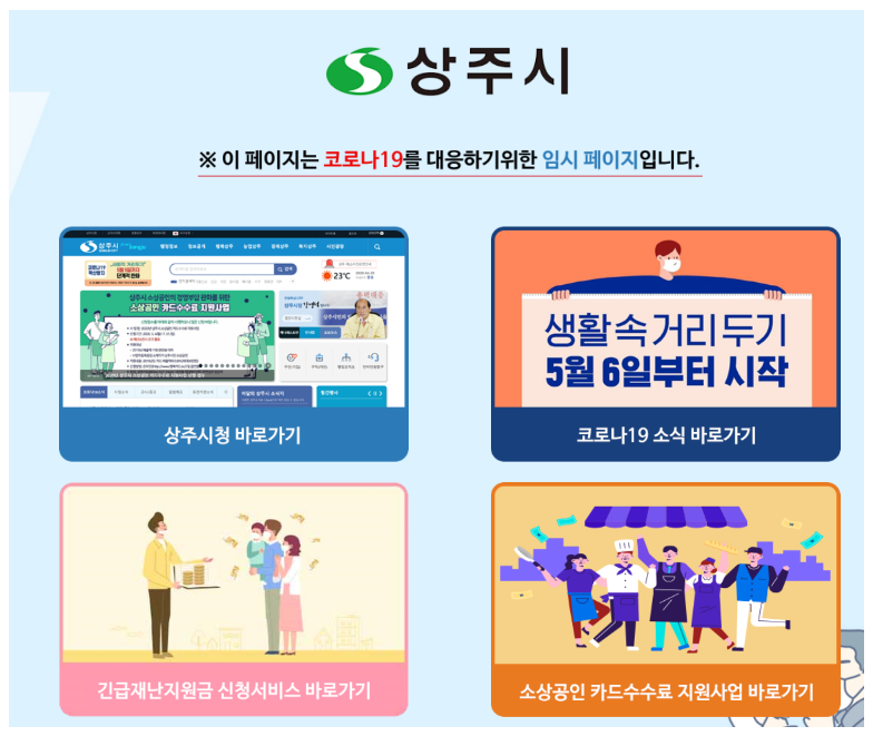 위 링크로 들어가시면 상주시청 홈페이지로 들어가게 됩니다. 그런데 평소와는 다른 홈페이지의 모습이 보입니다. 그 이유는 코로나 19 때문에 모든 기관이 비상이기 때문입니다.