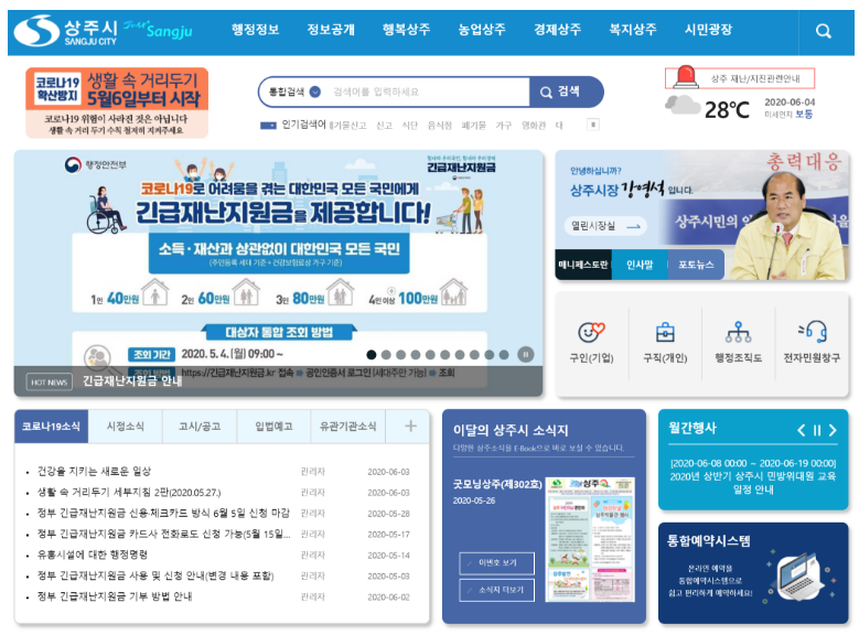 위 링크로 들어가시면 간단하게 원래 상주시청 홈페이지로 들어갈 수 있습니다. 여기에는 상주시에서 추진하고, 상주시민들이 누릴 수 있는 각종 정책과 정보를 확인할 수 있습니다.