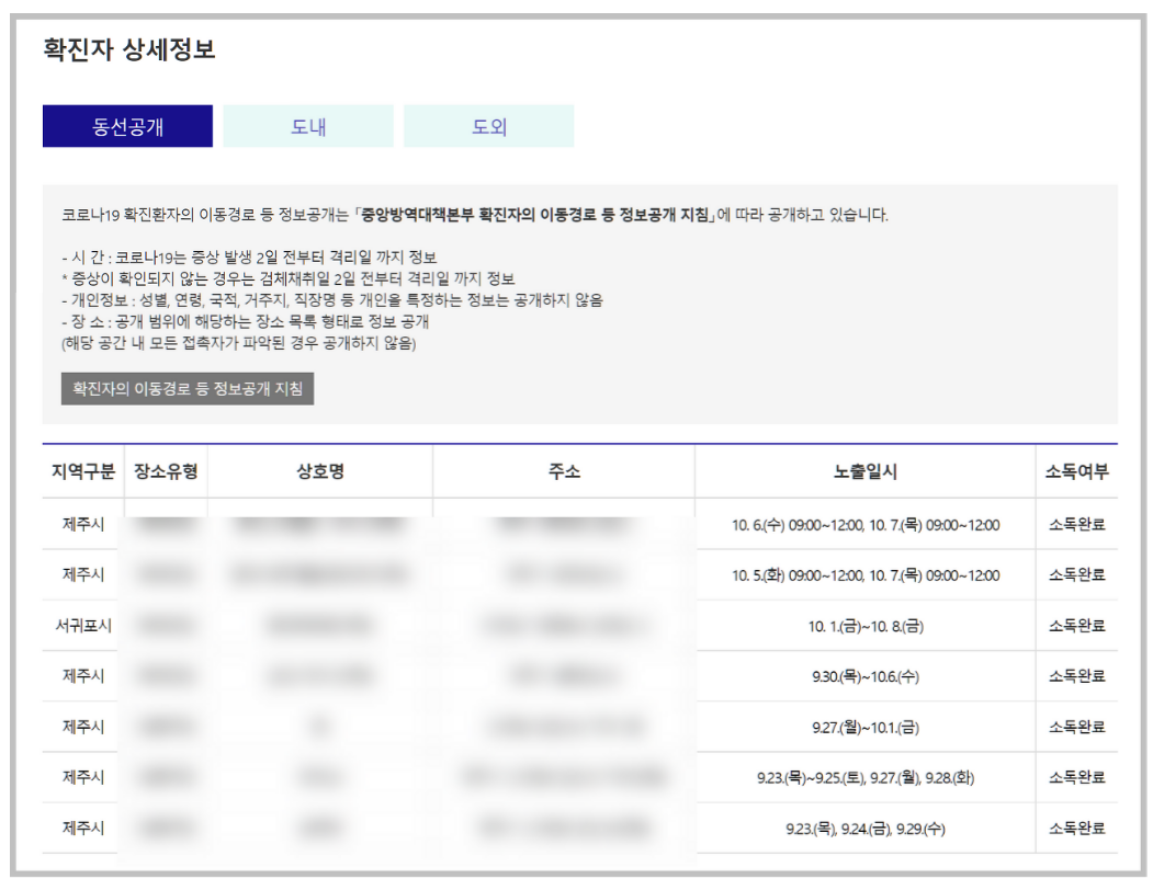 이 페이지에서 확인할 수 있는 중요한 정보는 코로나 동선공개입니다. 이 정보는 중앙방역대책본부 확진자 이동경로 등 정보공개 지침에 따라서 공개되고 있습니다. 증상 발생 2일전부터 격리일까지 정보만 공개를 하고 있습니다. 증상이 확인되지 않는 경우에는 검체채취일 2일전부터 격리일까지 정보가 공개가 됩니다. 그렇기 때문에 완벽한 정보는 아닙니다.