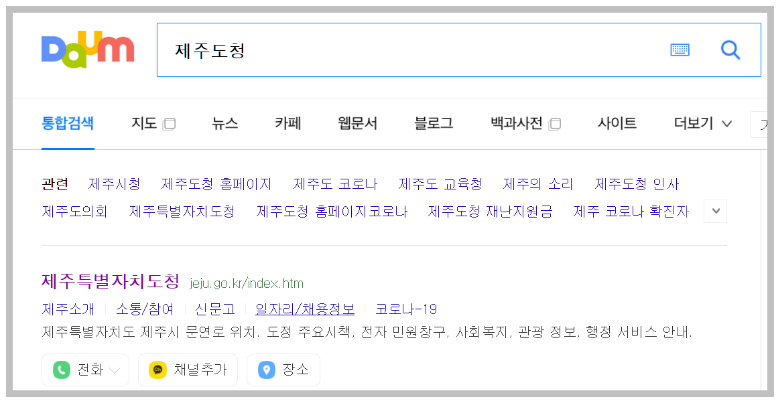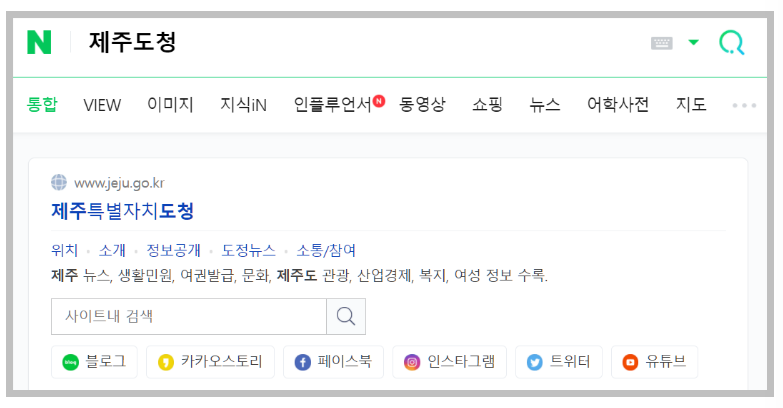 네이버에서 간단하게 '제주도청'이라고 검색을 하면 첫번째 검색결과로 제주특별자치도청 홈페이지가 나오게 됩니다. 이러한 모습은 다른 검색엔진에서도 비슷한 모습입니다.
