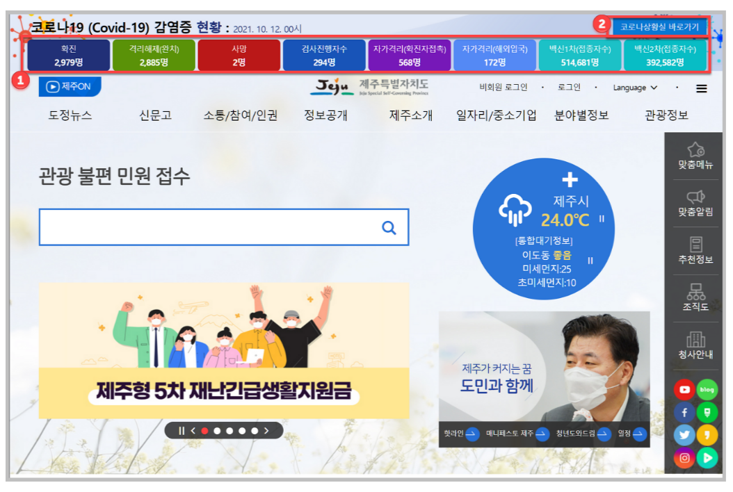 코로나19과 완전히 종식될때까지는 관련된 정보를 얻기 위하여 노력을 해야합니다. 이러한 정보를 얻기 위하여 가장 좋은곳은 지자체 홈페이지입니다. 제주에 거주하시는 분은 제주도청 홈페이지에 들어가시는 것이좋습니다. 제주시청이나 서귀포 시청도 괜찮습니다.