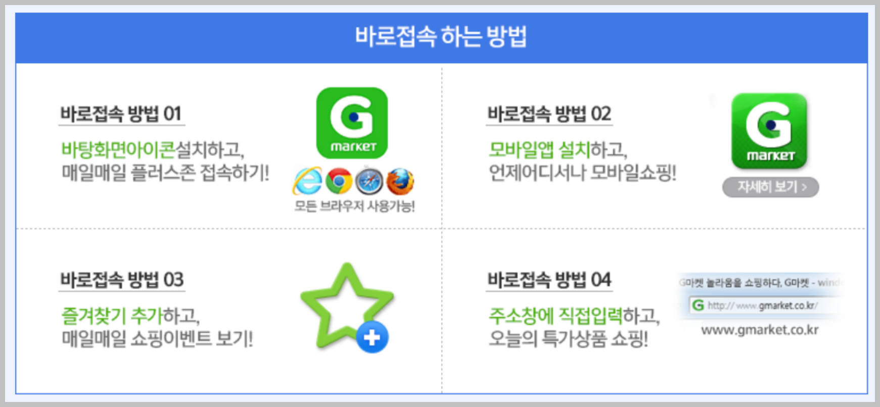 이렇게 네가지 방법이 있습니다. 이 중에서 가장 확실한 방법은 지마켓 바로가기 설치 방법입니다.