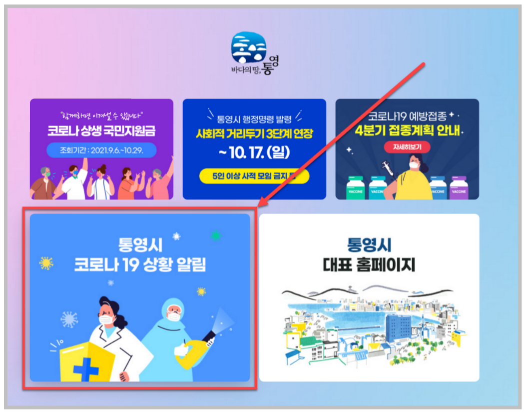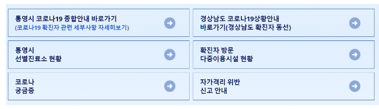 위 화면은 통영시청 홈페이지의 바로가기 페이지입니다. 왼쪽 아래를 보면 통영시 코로나19 페이지로 들어갈 수 있는 아이콘이 있습니다.