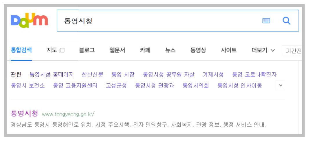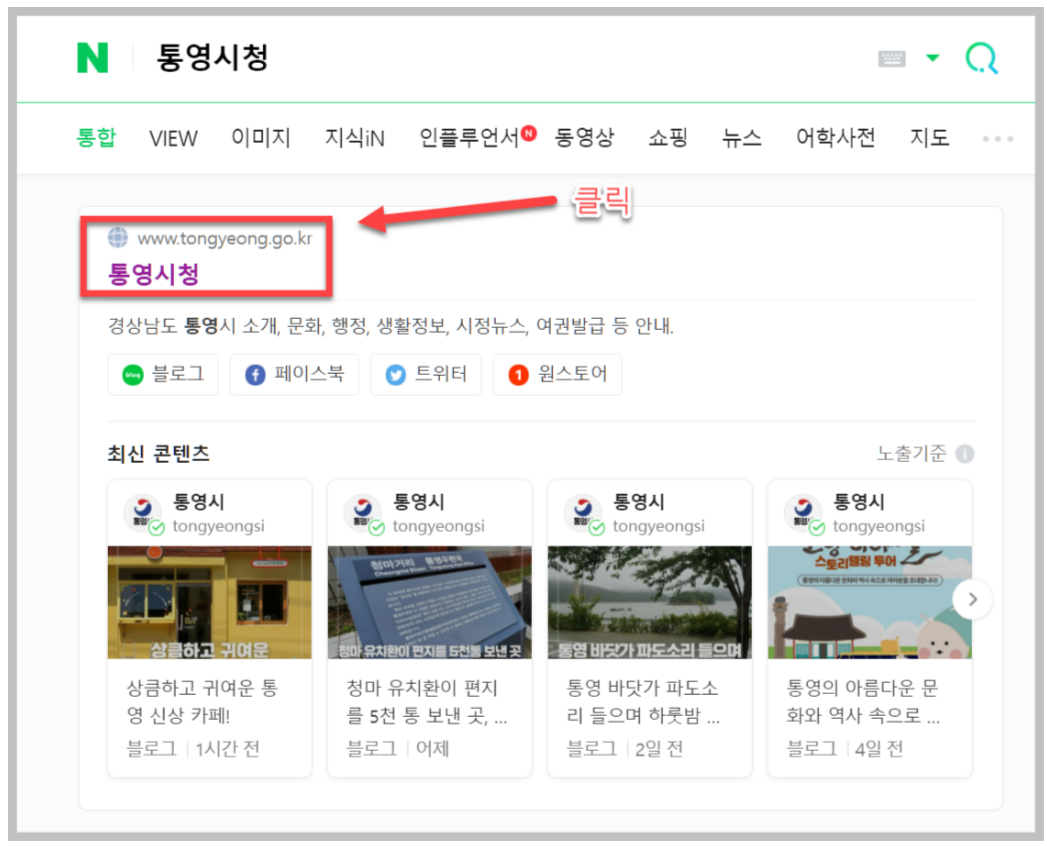 위 화면은 네이버에서 '통영시청'을 검색을 했을때의 모습입니다. 통영시청 홈페이지 링크를 제공할 뿐만아니라 블로그와 페이스북 등 여러가지 관련된 것들을 제공하고 있습니다.