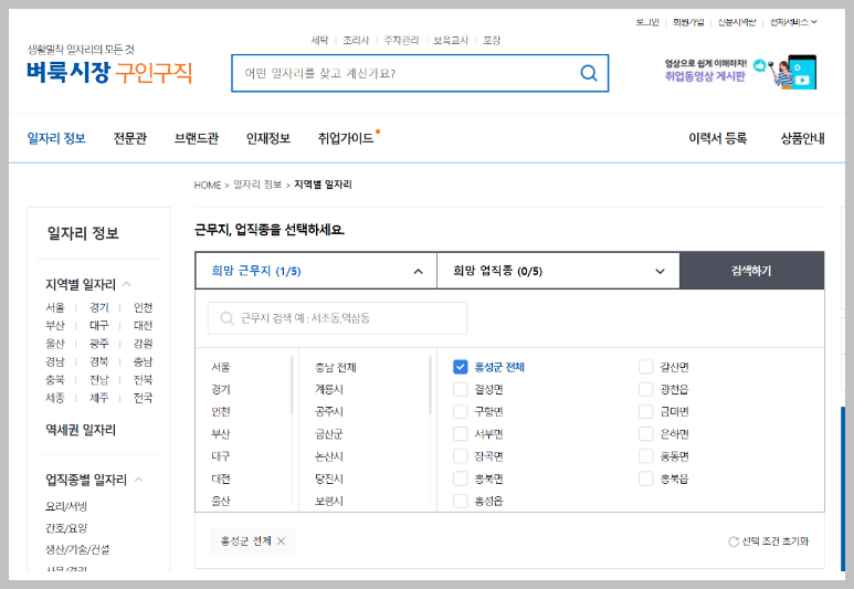 구인구직을 클릭을 하면 위와 같은 화면이 나오게 됩니다. 군 전체뿐만 아니라 읍면 단위로도 확인을 할 수 있습니다. 그 외에도 홍성 벼룩시장 신문은 다양한 정보를 취급하고 있습니다.