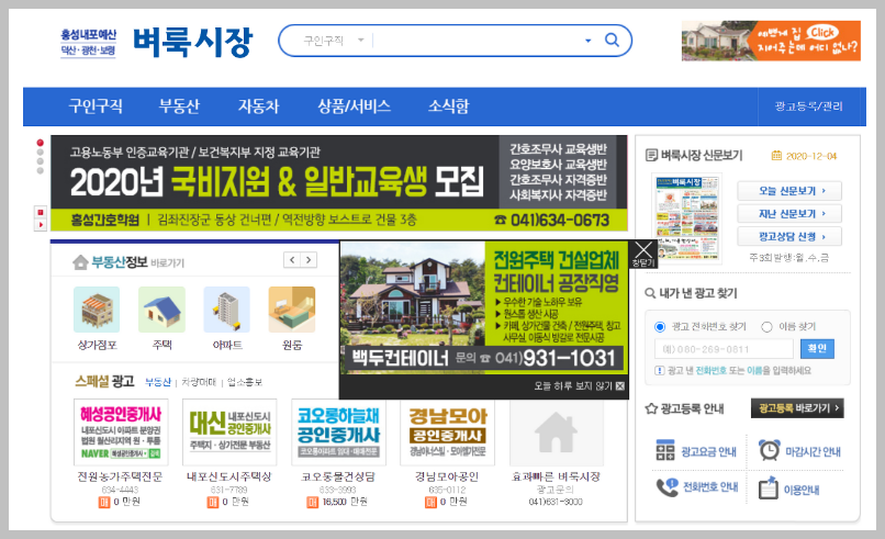 홍성 벼룩시장 홈페이지에 들어가면 위와 같은 화면을 볼 수 있습니다. 구인구직과 부동산 정보를 최우선으로 볼 수 있음을 확인할 수 있습니다.